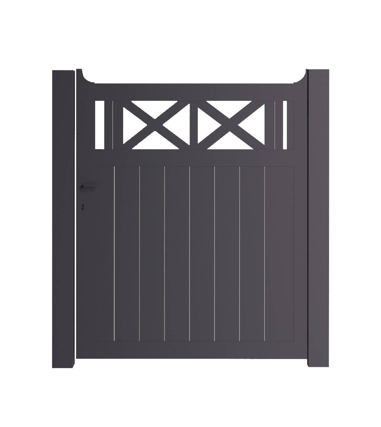 Deze poort brengt een klassiek, rustiek accent aan je oprit of tuinpad. Het bovenste deel met gekruiste lijnen zorgt voor een luchtige, decoratieve toets, terwijl het onderste paneel met verticale lijnen volledig gesloten is voor de nodige privacy. Een evenwichtige combinatie van stijl en functionaliteit, verkrijgbaar in diverse kleuren en afmetingen.